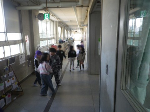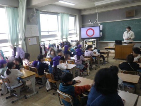 わくわく広場として,共愛こども園との交流を行いました。4月から1年生になる子どもたちが本校に来てくれました。1年生が学校を案内しました。