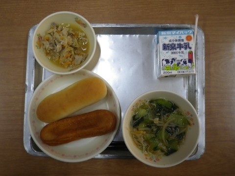 今日の献立:ミニパン・あげパン・牛乳・ビーフンスープ・豚肉のゴマ風味