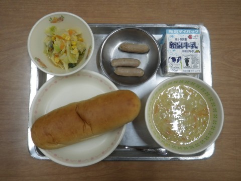 今日の献立:黒糖パン・牛乳・クマラスープ・野菜ソテー・焼きウインナー