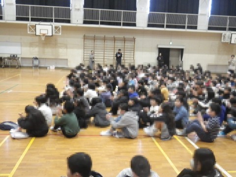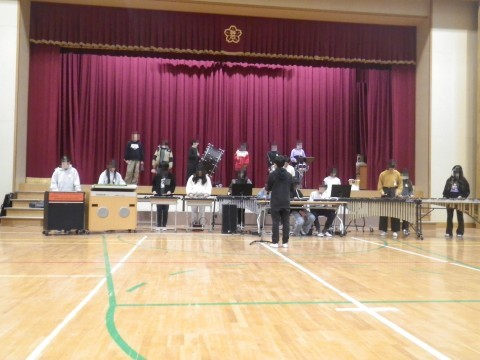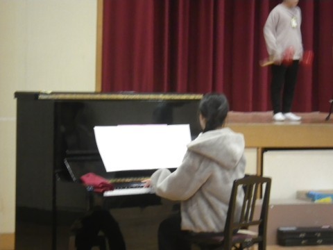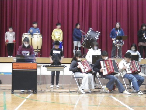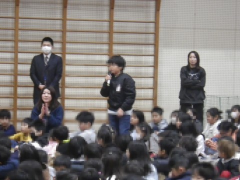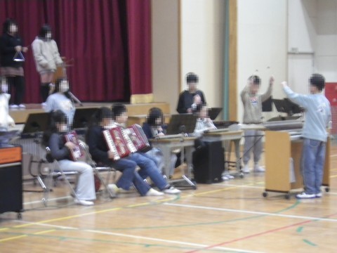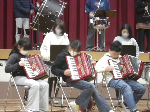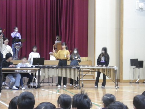 全校朝会で,卒業コンサートの合奏を披露しました。1年生~5年生の子どもたちが真剣に聞いてくれました。
