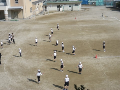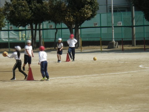体育では,リズム縄跳びの後,キックベースボールをしていました。