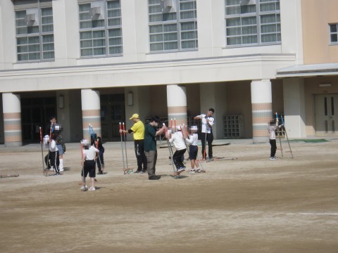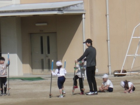 なかよし学級の低学年児童が,なかよし体育で竹馬に取り組んでいました。先生に補助してもらって,頑張っていました。