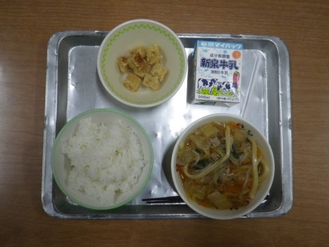 今日の献立:ご飯・牛乳・すき焼き風うどん・高野豆腐のから揚げ