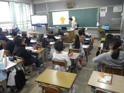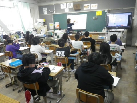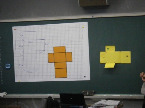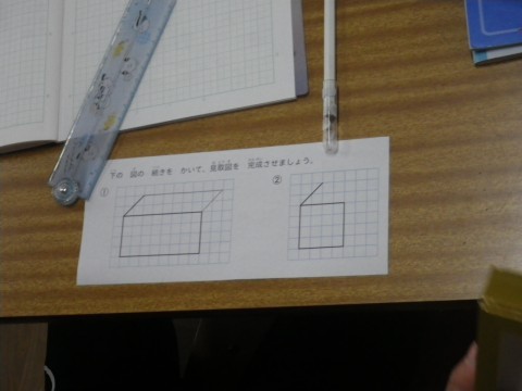 算数では,1組は見取り図の書き方の学習,2組は展開図の学習をしていました。