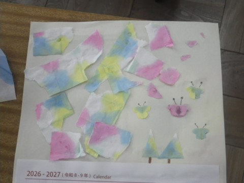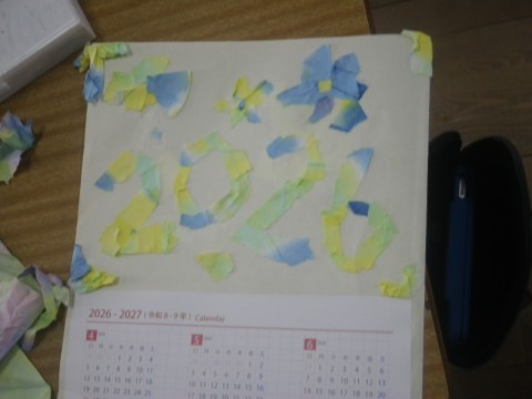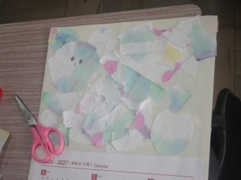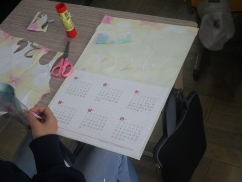 1組は図工,以前染めた紙をちぎり絵にして,カレンダーを作っていました。