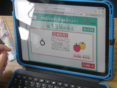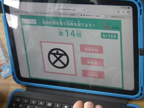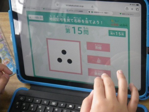 2組は社会。タブレットを使って,地図記号ドリルをしていました。