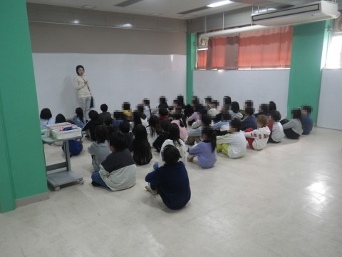学年集会をしていました。話し方・聞き方などの授業中のルールや学年目標について,学年全員で確認していました。