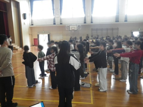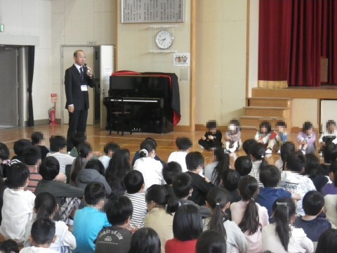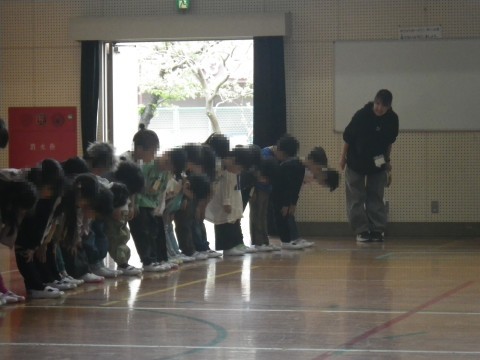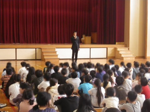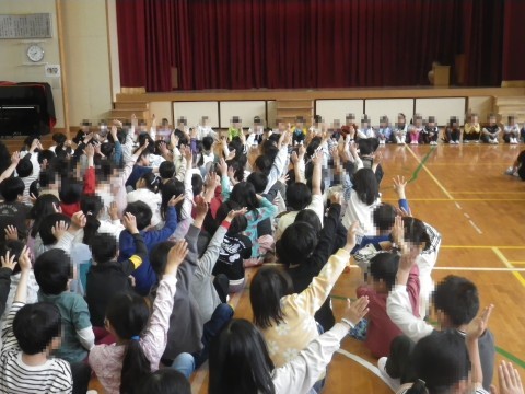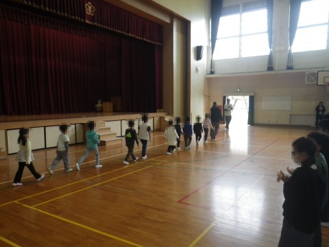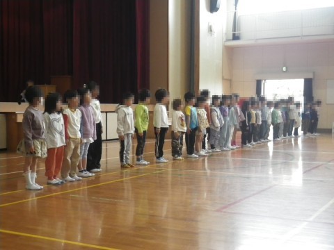 体育館に1年生を迎えて,神石小学校の児童314名が集合しました。6年生のお迎えの言葉の後,2年生から1年生は朝顔の種のプレゼントです。この朝顔は1年生が去年育てました。その後,1年生からの言葉がありました。終わった後,お辞儀もしっかりできました。校長が「困っている1年生がいたら助けてくれる人?」と問いかけると,全員の手が挙がりました。さすが神石小学校の子どもたちです。