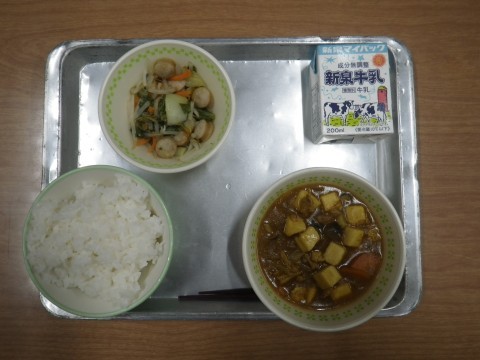 今日の献立:ご飯・牛乳・カレー豆腐・もやしとチンゲン菜のサラダ