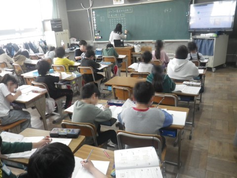 1組は算数。かけ算(9×7)の答えの求め方を考えていました。