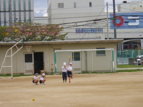 1時間目はなかよし体育。ボールを投げたり,フラフープをしたりしました。