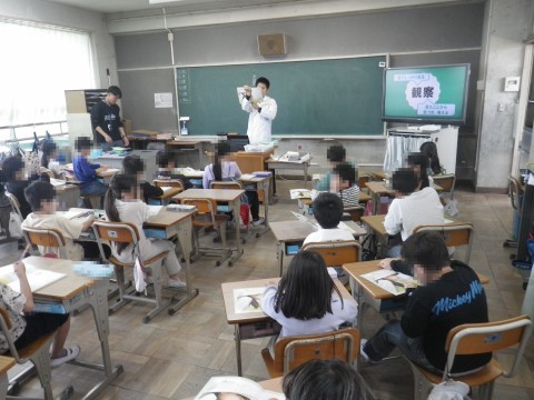 2組は理科,3年生になって理科の学習が始まりました。先生は白衣を着て授業していました。