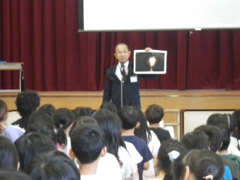 校長は,エジソンが電球を発明した話を例にして,失敗を恐れず,いろいろなことに挑戦しようと話しました。