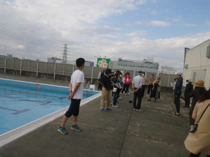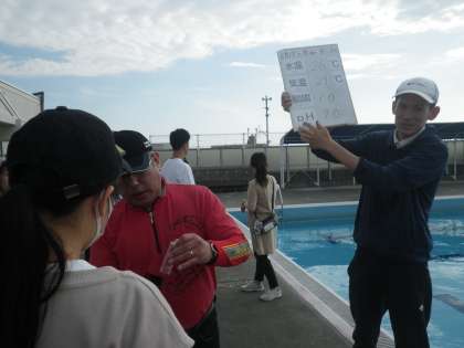 月曜日から始まる水泳授業に向けて、ろ過機の使い方や塩素・PHの図り方等の研修をしています。