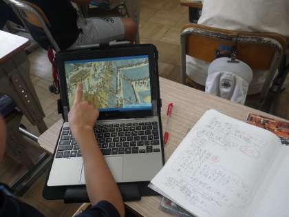 社会では、仁徳天皇陵と大仙古墳につて、資料を見て気づいたことを出し合います。古墳を作る様子の資料を見て、身分の差があることに気づきます。