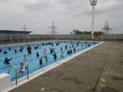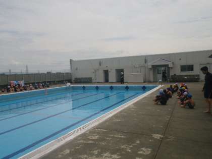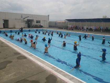 初めての水泳学習です。風が吹くと少し寒いようですが、元気に楽しく活動しています。