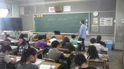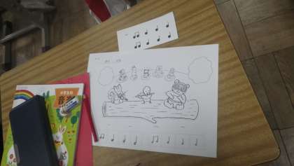 音楽の学習です。リズムを聞き取り、聞き取ったリズムをプリントに書き込みます。早くできた人は色塗りにも丁寧に取り組んでいます。