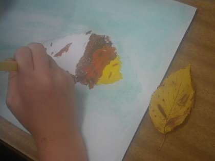 図工の時間、絵具を使って、落ち葉を描いていました。細かなところまでしっかり見て、描いていました。