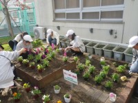 花ボランテイアの方と一緒に美化委員会の6年生が校門横の花壇に花を植えました。きれ...
