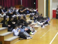 6年生の子どもたちはしっかり聞いています。次に5年生が「それぞれの空」を歌った後...