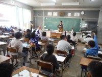 1組は体育,シュートゲームの準備運動で,ボール投げをしていました。2組は算数,3...