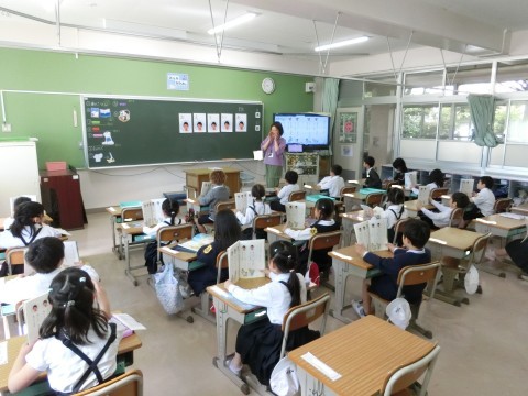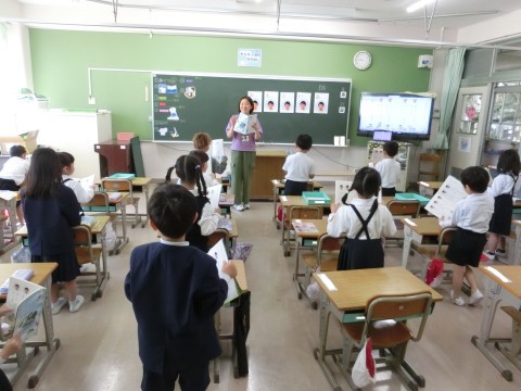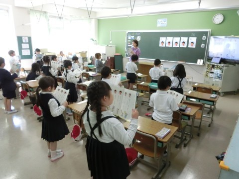 2時間目の国語の授業の様子です。歌に合わせて「あ・い・う・え・お」を元気いっぱいに読むことができました。