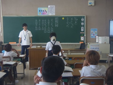 9月から来ている教育実習生が国語「ちいちゃんのかげおくり」で授業をしています。先生になるための第1歩ですね。