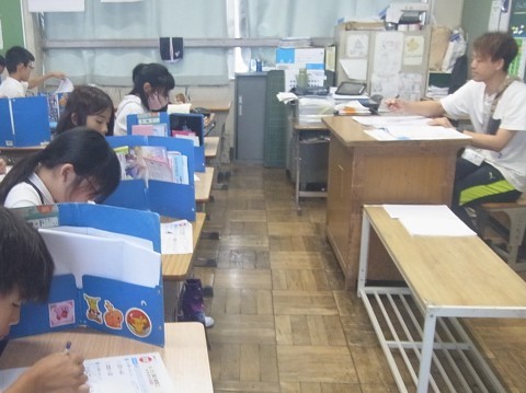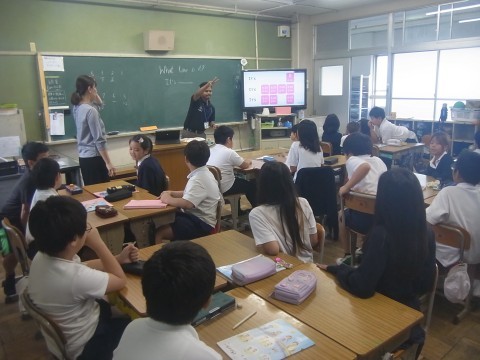 1組は算数テストをしていました。2組は外国語活動でNSの先生と「What time is it?」について学習していました。
