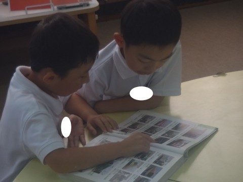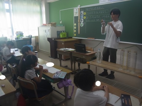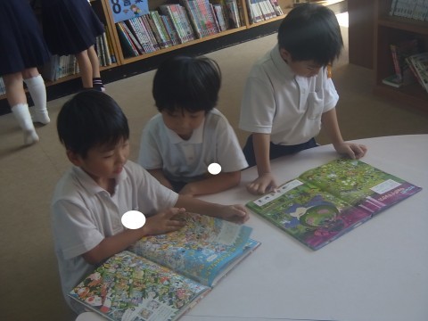 10月1日(水)1年生 公開日 2025/10/01 更新日 2025/10/01 1年生 1組は図書館で本を読んでいます。2組は算数で「どちらがおおい」の学習をしています。大きさの違う3本のペットボトルに入った水の量を比べていました。