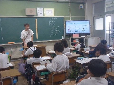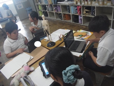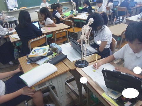 1組は算数で概数の学習をしています。2組は理科でヒトの体のつくりと運動について学習しています。骨格の標本を各グループで見て考えています。