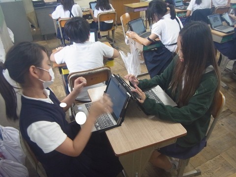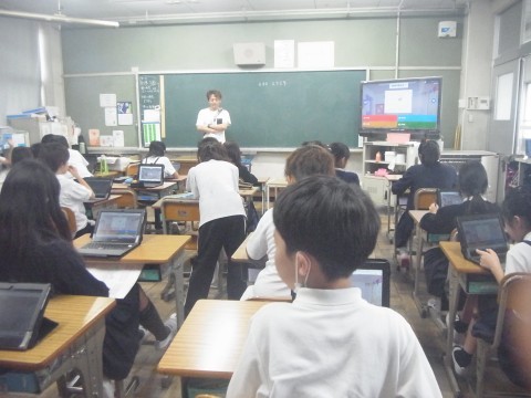 1組はタブレットで都道府県クイズに答えていました。2組は環境問題について、各グループに分かれて調べ学習をしていました。