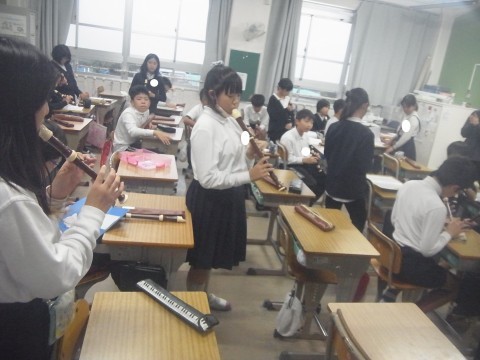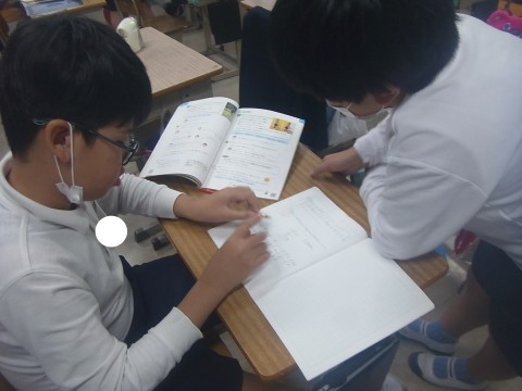 1組はリコーダーの練習をしていました。2組は算数で平均の学習をしていました。お互いに教えあっていました。