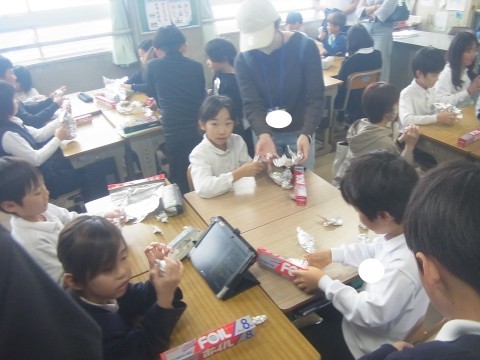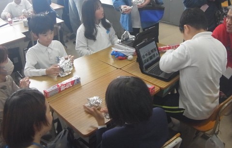 3年生は図工でアルミホイルを使って動物を作っていました。タブレットで作りたい動物を探して形を作っていました。