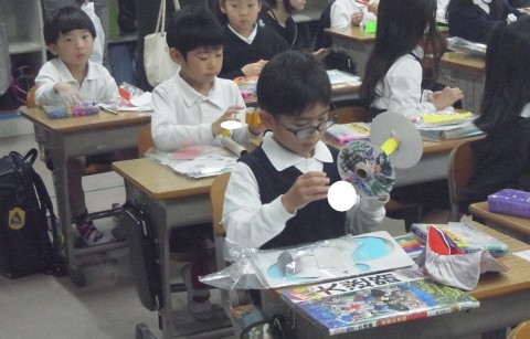 1・2組ともに図工で紙皿くるくるの作品を作っていました。