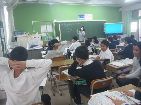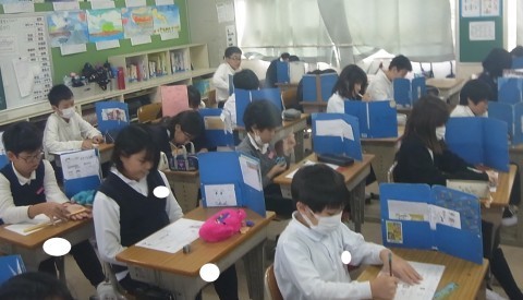 1組は社会で日本の工業生産と外国とのかかわりについて学習していました。2組は外国語のテストをしていました。