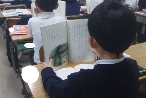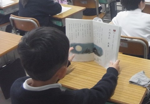 1・2組ともに国語で「たぬきの糸車」の音読をしていました。