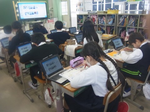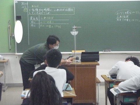 1組は社会で「情報をつくり、伝える」の学習をしていました。教科書の資料を読みながらタブレットでまとめていました。2組は理科でふりこのきまりの学習をしていました。1往復する時間と振れ幅の関係について実験していました。