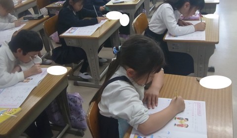 1組は書き方ノートをしていました。2組は道徳「おふろそうじ」で勉強や仕事をすることのよさについて考えていました。