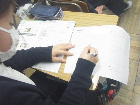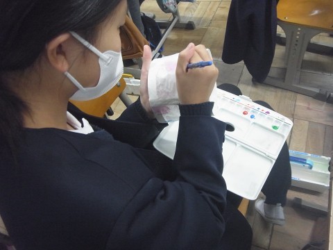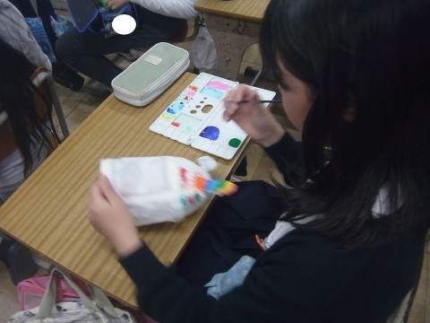 1組は体育で保健の学習をしていました。喫煙の害について教科書を見ながら、プリントの課題に取り組んでいました。2組は図工で「和紙で作るランプシェード」作りをしていました。形作ったものに色や柄を描いていました。