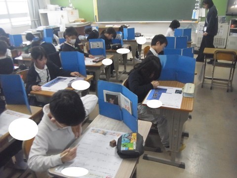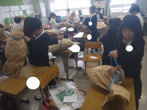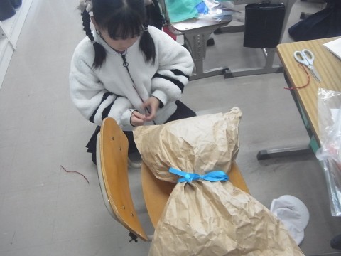 1組は図工で「くしゃくしゃぎゅ」の作品を作っていました。紙袋に新聞紙を詰め込んで形を作り、モールや花紙などを使って飾り付けていきます。2組は国語で漢字の確かめテストをしていました。