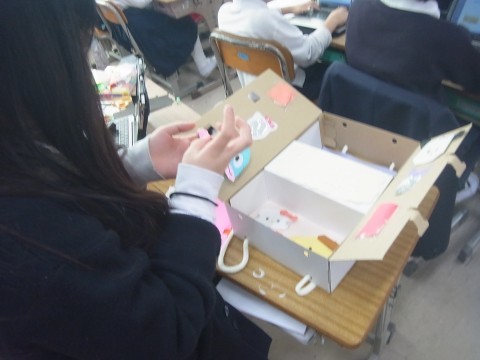 図工でランドセルづくりをしています。中は洋服屋さんなどいろいろ考えて作られていました。