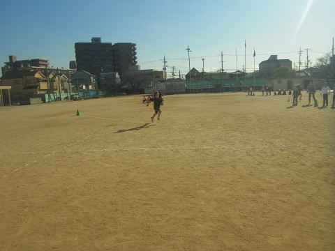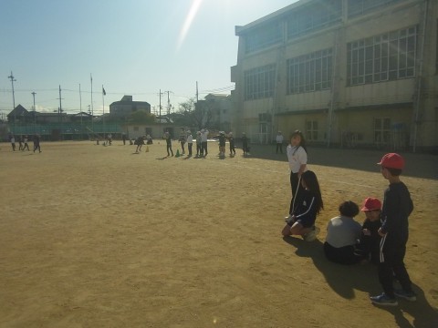3年生は体育でキックベースをしていました。ルールをしっかり守って、試合をしていました。