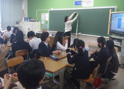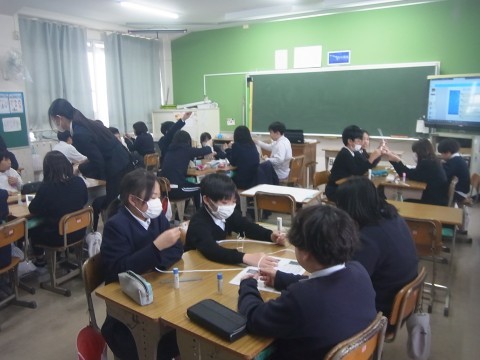 5年生は図工で「黒板の上のあの子」というテーマで作品を作りました。画用紙を細く切ってつなげて1本にして、さまざまな様子の人型を作りました。