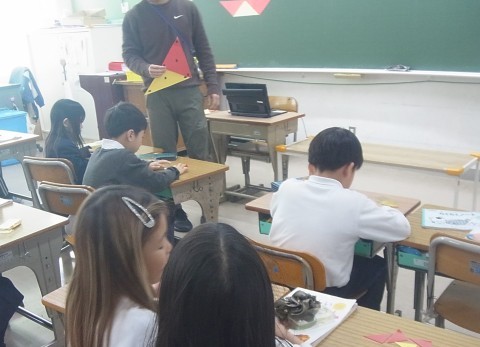 1組は音楽で「おちゃらかほい」をしていました。2組は算数で「かたちづくり」の学習をしていました。いろいたを並べて先生が示したものと同じ形を作っていました。