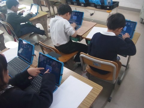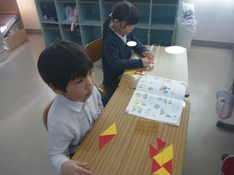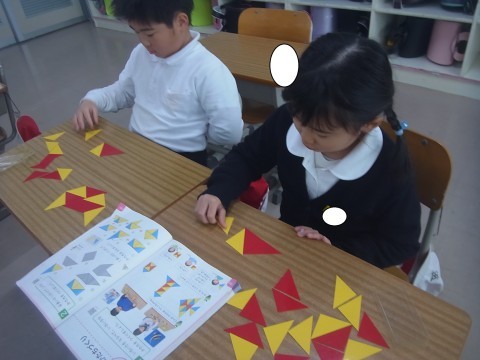 1組は算数でかたちづくりの学習をしていました。いろいたを使って先生が指示したものと同じ形を作っていました。2組は新しいタブレットのGIGA開きをしていました。
