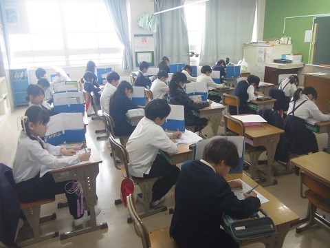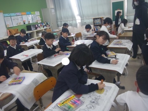 1組は算数のテストをしていました。2組は作品袋に絵を描いていました。