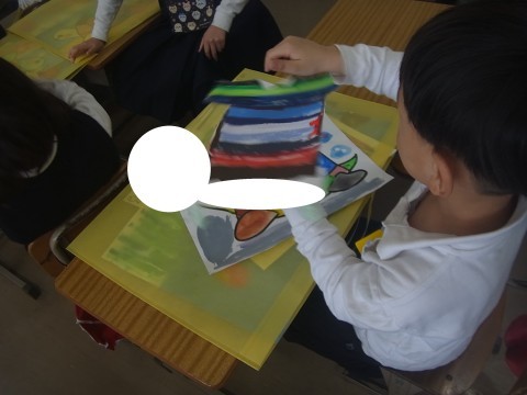 2組は自分の作品を作品袋に入れています。1学期や2学期に取り組んだ作品を見ると、とても懐かしいようで、子どもたちもうれしそうでした。