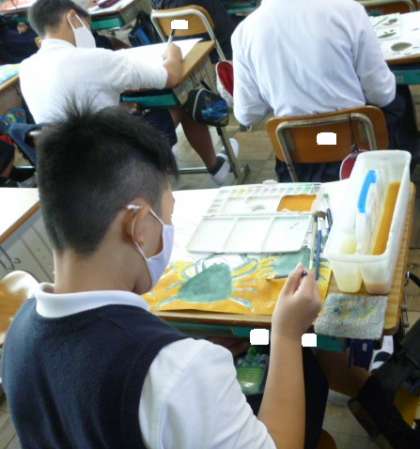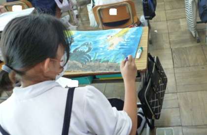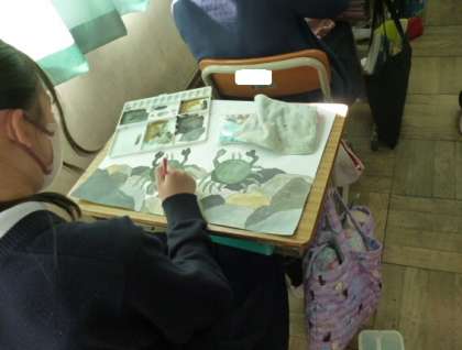 図工では、国語で学習した「やまなし」から想像した絵を描いていました。