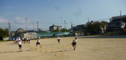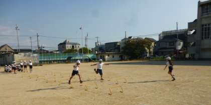 体育では、おにごっこやこおりおにをして十分体を動かした後、ハードルの練習をしていました。