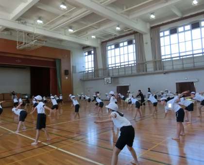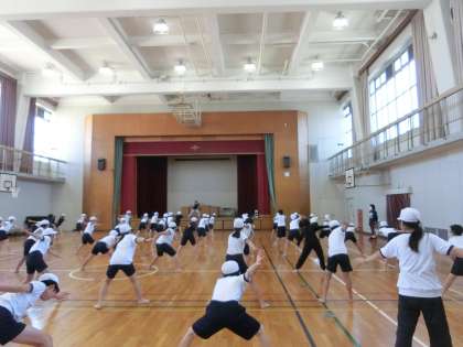 体育館で、ソーラン節の踊りを練習していました。1つ1つの動きを確認したり、1組と2組でずらして踊るパートの練習をしたりしていました。
